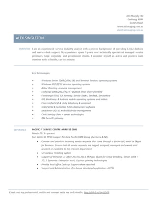 The document is an resume for Alex Singleton that outlines his experience providing IT support and services over 9 years in various roles including service desk analyst, systems engineer, and helpdesk officer. It details his technical skills and experience supporting a wide range of technologies. The resume also lists his education and certifications.