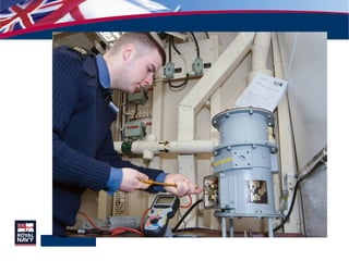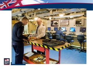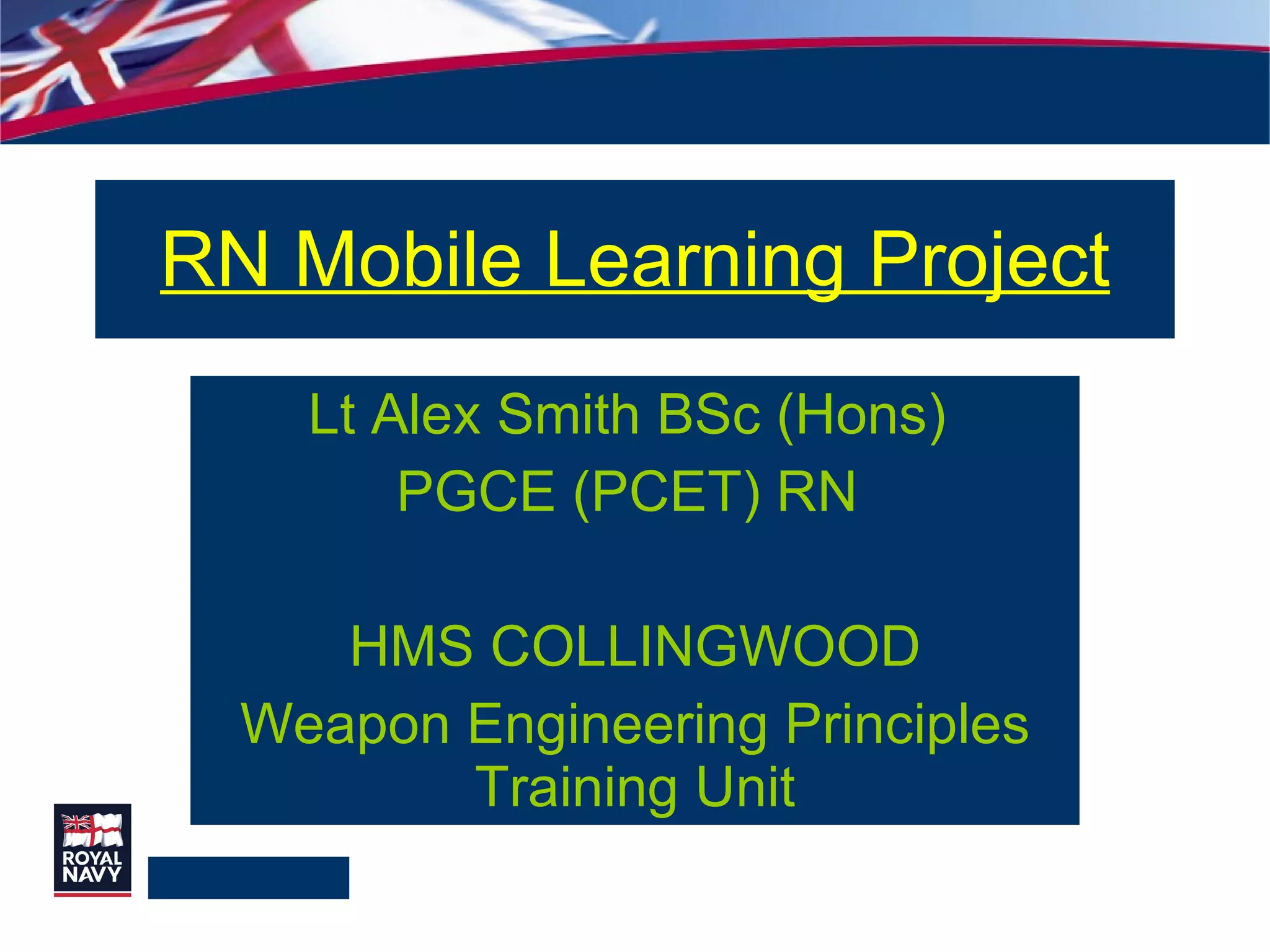 This document discusses a mobile learning project for the Royal Navy. It aims to develop an e-learning library using rapid authoring software to supplement technical training for engineering technicians and provide pre-course, in-course, and post-course learning materials. The software allows subject matter experts to easily create multimedia lessons and tests that can be accessed on the Defence Learning Portal or using Sony PlayStation Portables for flexible, detached learning. An initial trial distributing PSPs to trainees yielded positive feedback and encouraged peer-to-peer interaction. The project aims to continue developing lessons and expanding the trial.