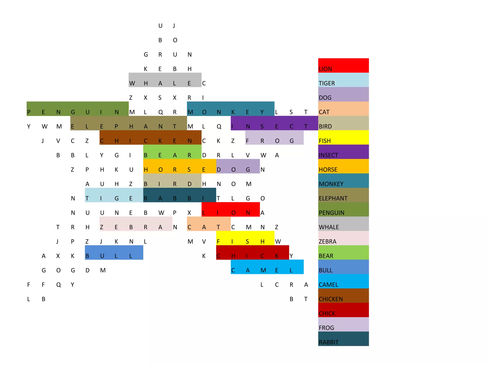 The document contains a scrambled grid of letters that spell out the names of different animals hidden within including lion, tiger, dog, cat, monkey, elephant, penguin, whale, zebra, bear, bull, chicken, camel, frog, and rabbit.