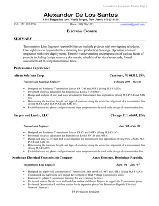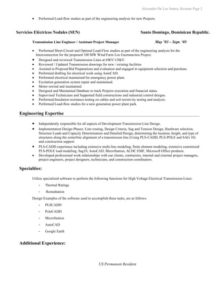 The document is a resume for Alexander De Los Santos, an electrical engineer with over 15 years of experience designing and reviewing high voltage transmission lines between 69kV and 500kV. He has worked for several engineering firms in the United States and Dominican Republic, and has extensive experience using software like PLS-CADD, PoleCADD, and SAG10 to design transmission structures, configure circuits, and perform load flow analyses. His resume lists his professional experience, engineering expertise, education, and professional references.