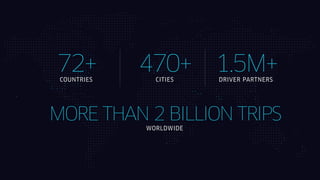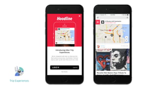 The document discusses Uber's APIs and how they can be used to build experiences that enhance transportation. It notes that Uber has facilitated over 2 billion trips across more than 470 cities. Developers can integrate their apps with Uber's APIs to authenticate users, request rides, access ride details and context through the trip to improve users' experiences. The document provides examples of how ride context could be used to suggest local guides, play media based on trip duration, and control smart home devices like heating when approaching home.