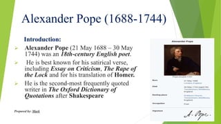 Alexander Pope was an 18th century English poet best known for his satirical verse and translation of Homer's works. He was born into a Catholic family at a time when Catholics faced significant legal restrictions. His education ended early due to Pott's disease, but he was a prolific self-educated reader of classical texts. His most famous works included Essay on Criticism, The Rape of the Lock, and translations of Homer's Iliad and Odyssey. Though his religious background and poor health isolated him, Pope was a highly influential poet and considered a master of Neoclassical style during his lifetime.
