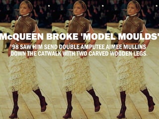 McQueen was known for his controversial and boundary-pushing runway shows in the 1990s that sparked debates across the country. His 1992 show put him on the map by exposing the "bum crack" and spawned the trend for low-rise jeans. McQueen's most memorable eccentric shows from the 1990s included models walking in metal cages in 1997 and a hologram of Kate Moss walking on the runway. McQueen had a huge impact on fashion through his beautifully crafted yet shocking and creative designs.