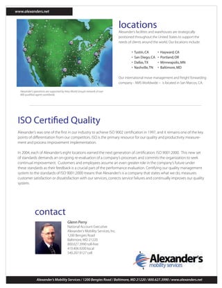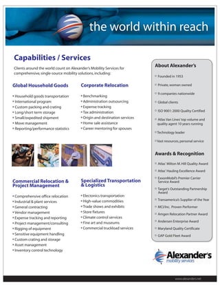 Alexander's Mobility Services provides comprehensive relocation and transportation services globally, including household goods moving, corporate relocation, storage, and specialized transportation of items like electronics and fine art. It has locations across the US and is ISO 9001:2000 quality certified. Alexander's works with Atlas Van Lines and uses their large network to provide services worldwide.