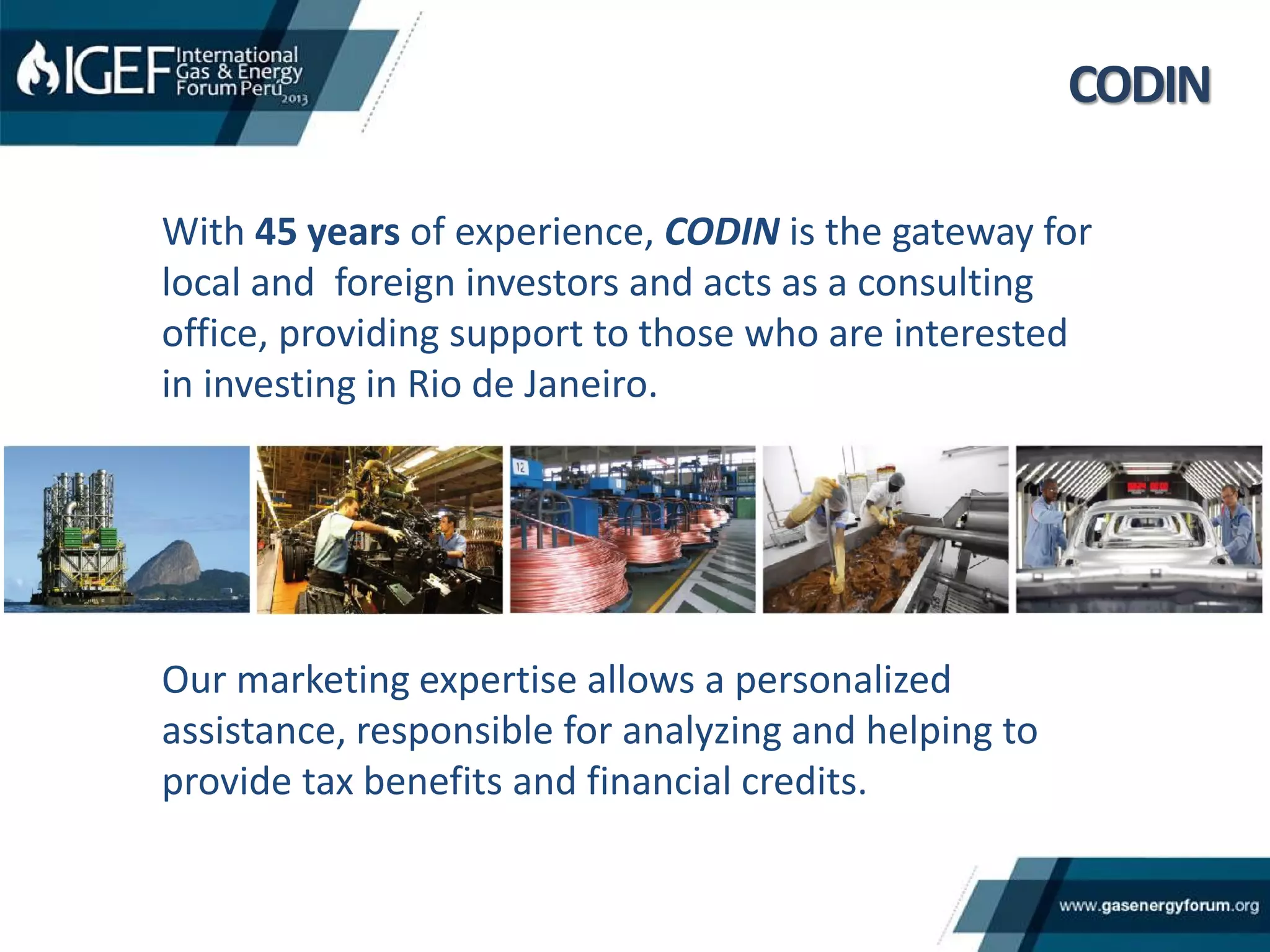 The document outlines the investment opportunities and economic development strategies in Rio de Janeiro, highlighting the region's growth in sectors such as energy, industry, and services. It emphasizes local content and infrastructure investment aimed at maximizing domestic industry participation and generating employment. With significant potential in oil and gas production, as well as various major investment projects, Rio de Janeiro is positioned as a key area for both local and foreign investors.