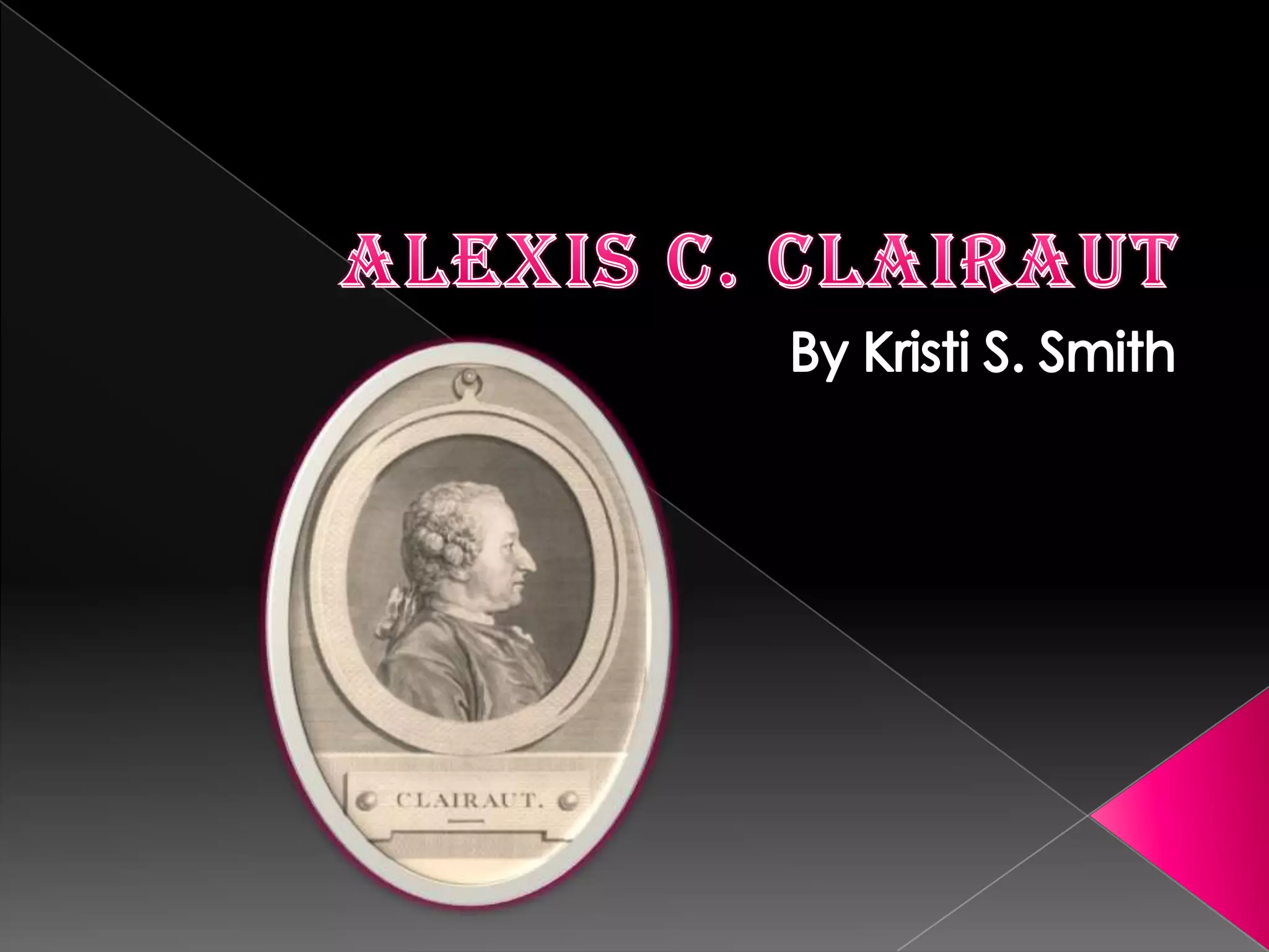 Alexis C. Clairaut was a French mathematician and child prodigy born in Paris. He wrote a memoir on geometrical curves that gained him admission to the Paris Academy of Sciences at a young age. Clairaut participated in an expedition that confirmed Newton's theory of the Earth's spherical shape and published a work proving the Earth is flattened at the poles. He created a solution to the three-body problem regarding the motions and positions of three gravitational bodies over time. Though a genius, Clairaut's indulgent lifestyle weakened his health and he died in Paris at age 52.
