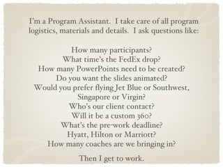 Alexandra Henry is a Program Assistant who handles all logistics for programs including determining participant numbers, scheduling deliveries and meetings, creating presentation materials, selecting travel and lodging options, and coordinating other details. Personally, she enjoys adventure, music, art, film, travel, and spending time with family and friends.