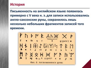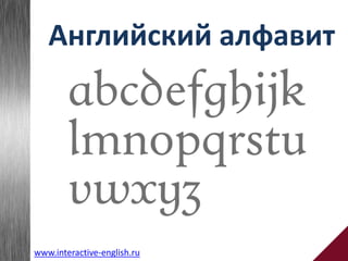 Английский алфавит произошел от латинского и состоит из 26 букв, из которых 5 являются гласными, а 21 — согласными. Он имеет различные диграфы, и разные звуковые соответствия для букв, такие как 'sh' для [ʃ] и 'th' для [ð] или [θ]. Современные вариации произношения, особенно между британским и американским английским, приводят к различиям в звучании некоторых букв, например, 'z'.