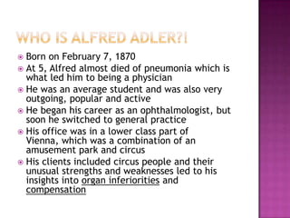 - Adler developed theories around birth order and its impact on personality, organ inferiorities and compensation, masculine protest, and social interest. He believed that understanding an individual's subjective experiences and feelings of inferiority was key to analyzing their behavior and psychological issues.