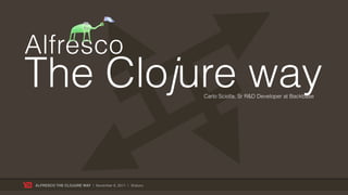 The document summarizes Carlo Sciolla's blog post about using Clojure to interact with the Alfresco content repository. It shows how to write a function in Clojure to loop through all nodes in a repository and print their names, and compares the Clojure code to the equivalent Java code. It also discusses some Clojure concepts like immutable data structures, macros, and sequence processing that make the Clojure implementation more concise and functional than the object-oriented Java code.