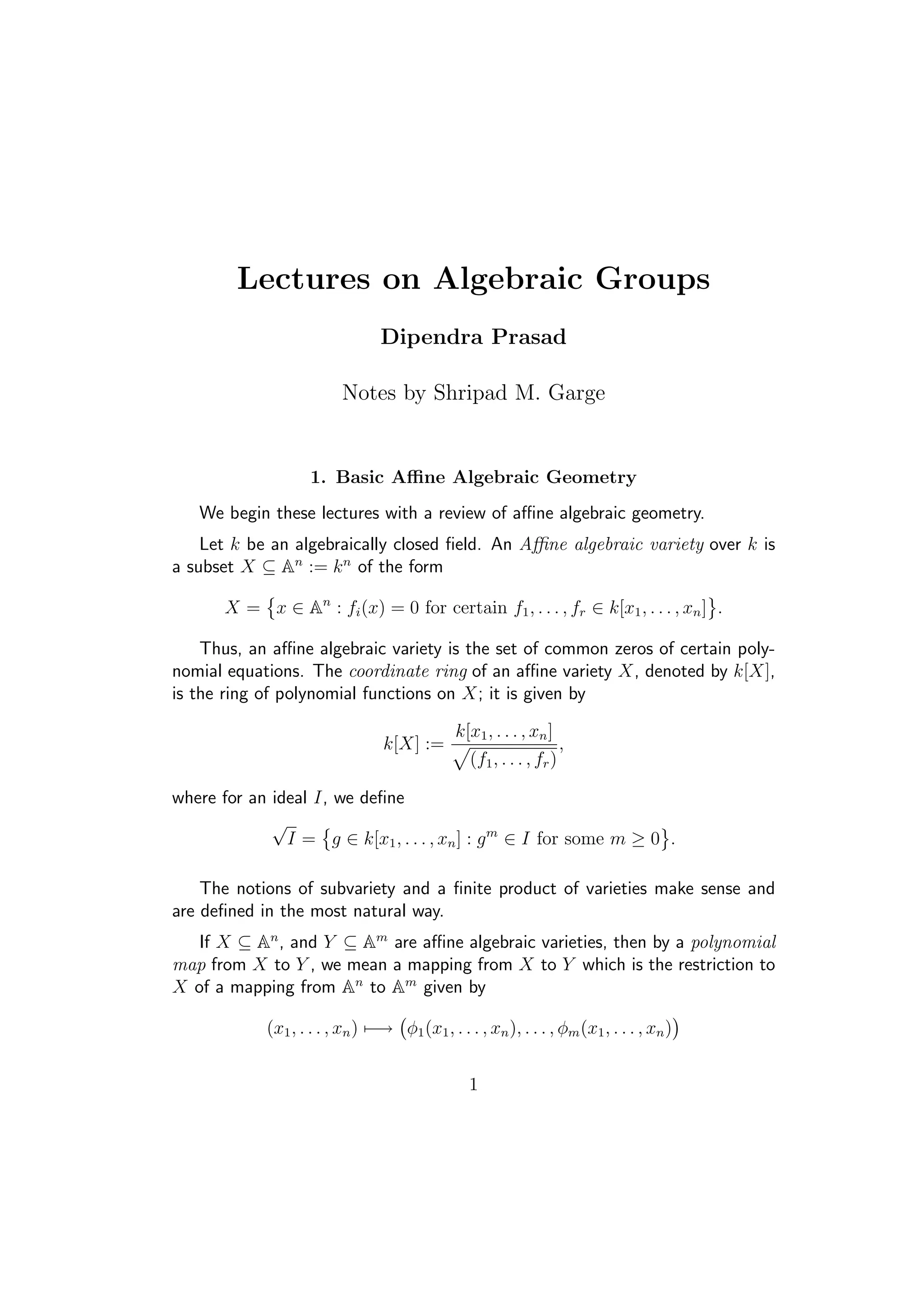 1. An affine algebraic group G is an affine algebraic variety that is also a group, such that multiplication and inverse maps are morphisms of varieties. Examples include GLn, SLn, finite groups.
