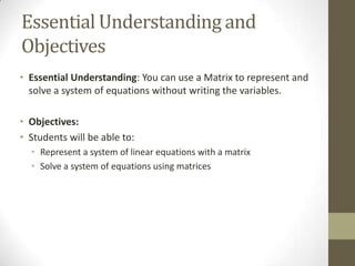 This document discusses representing and solving systems of linear equations using matrices. It defines what a matrix is and how to identify matrix elements. A system of equations can be represented by a matrix with each row representing an equation and each column representing a variable, except the last column which holds the constants. To solve the system, the matrix is row reduced into reduced row echelon form through operations like row switching, scalar multiplication, and row addition. The solutions can then be read from the reduced matrix. Graphing calculators can also use the rref function to row reduce a matrix representing a system of equations and directly give the solutions.