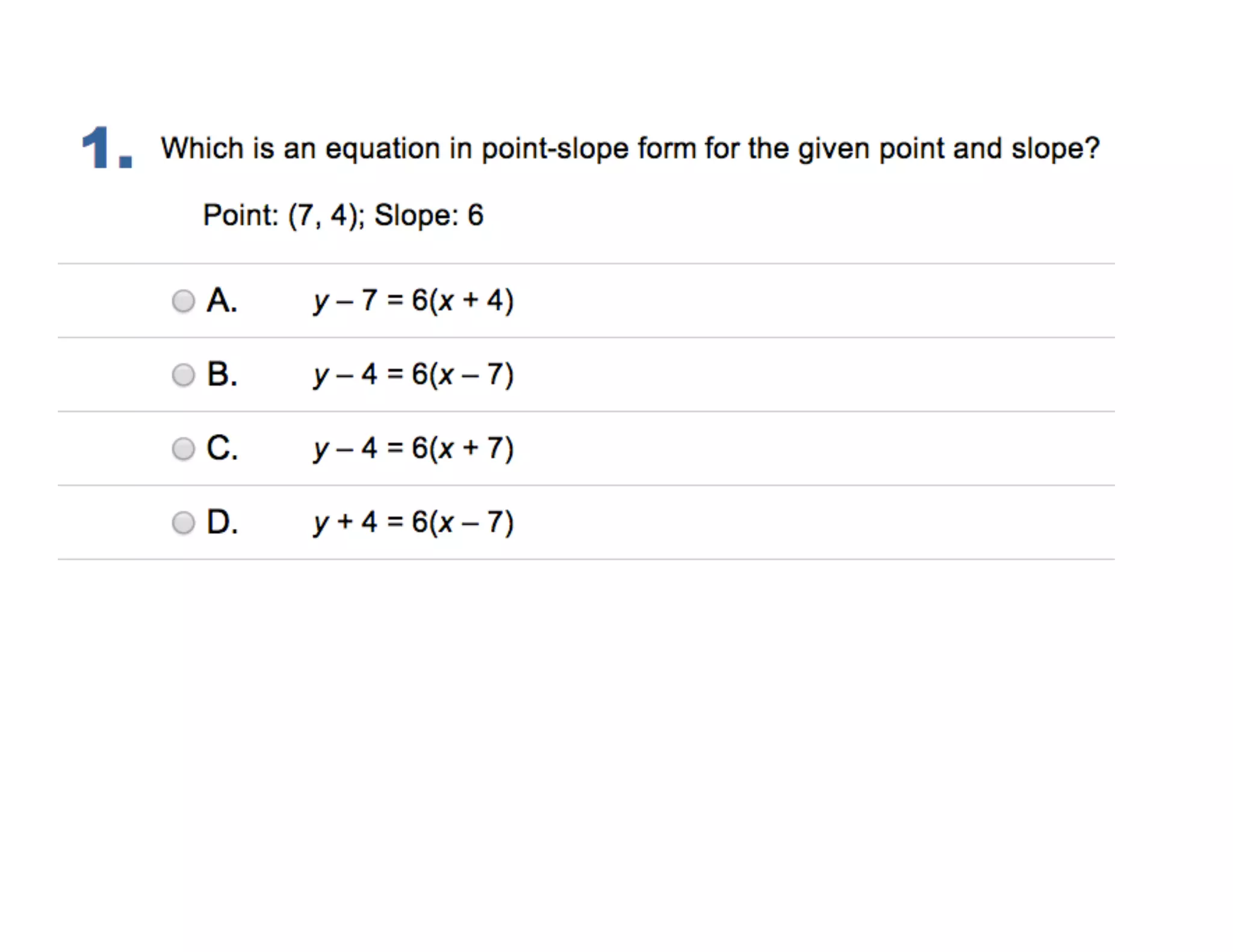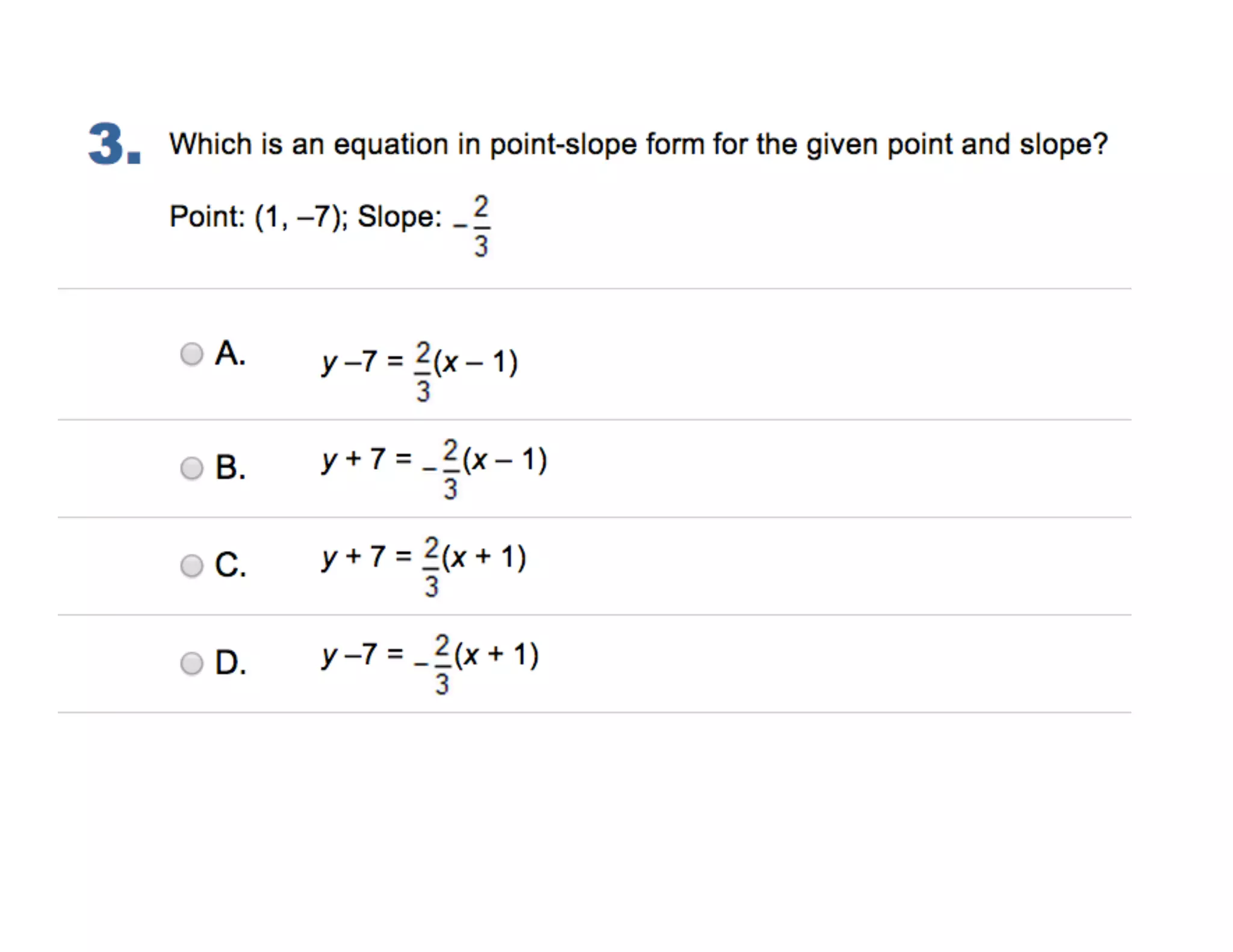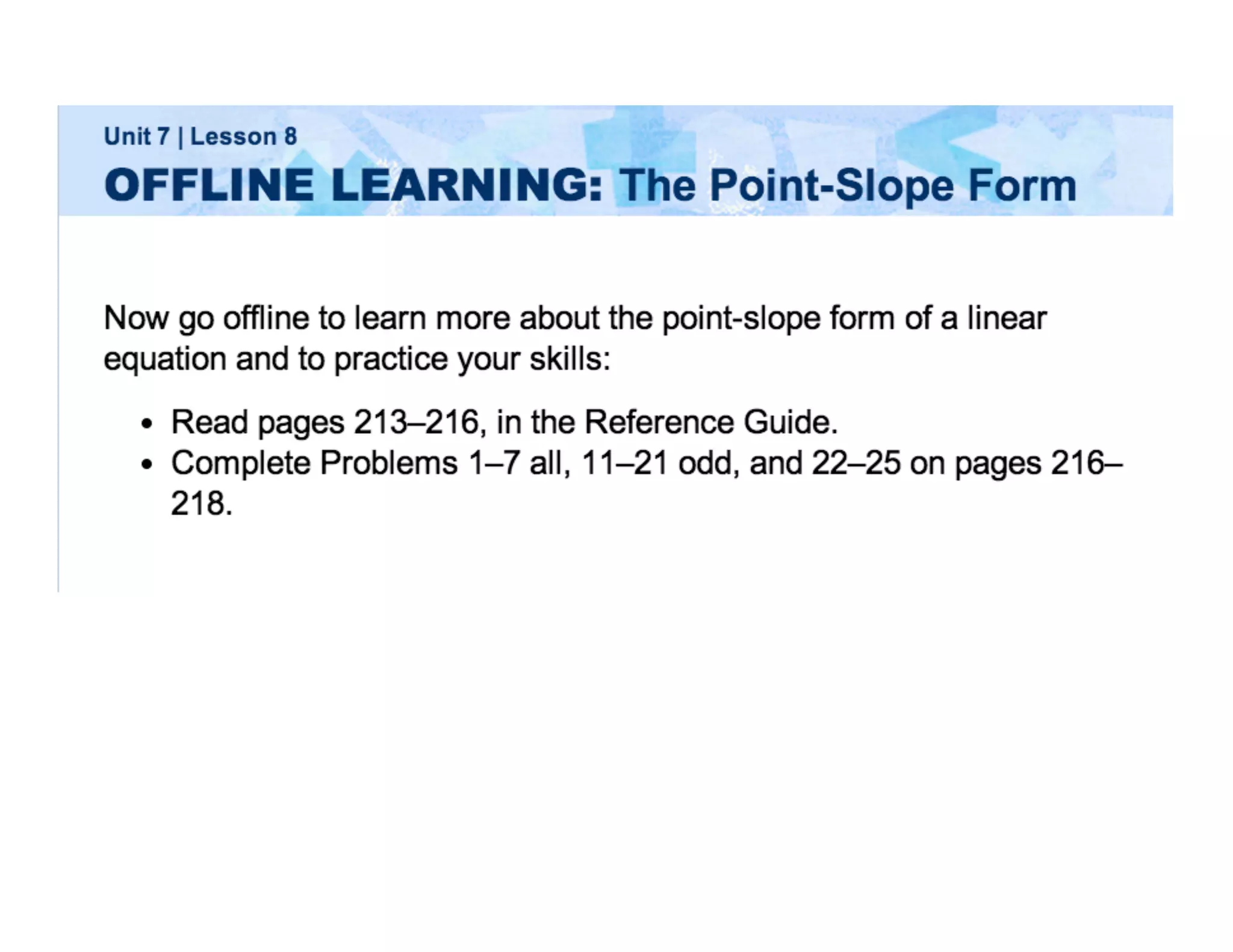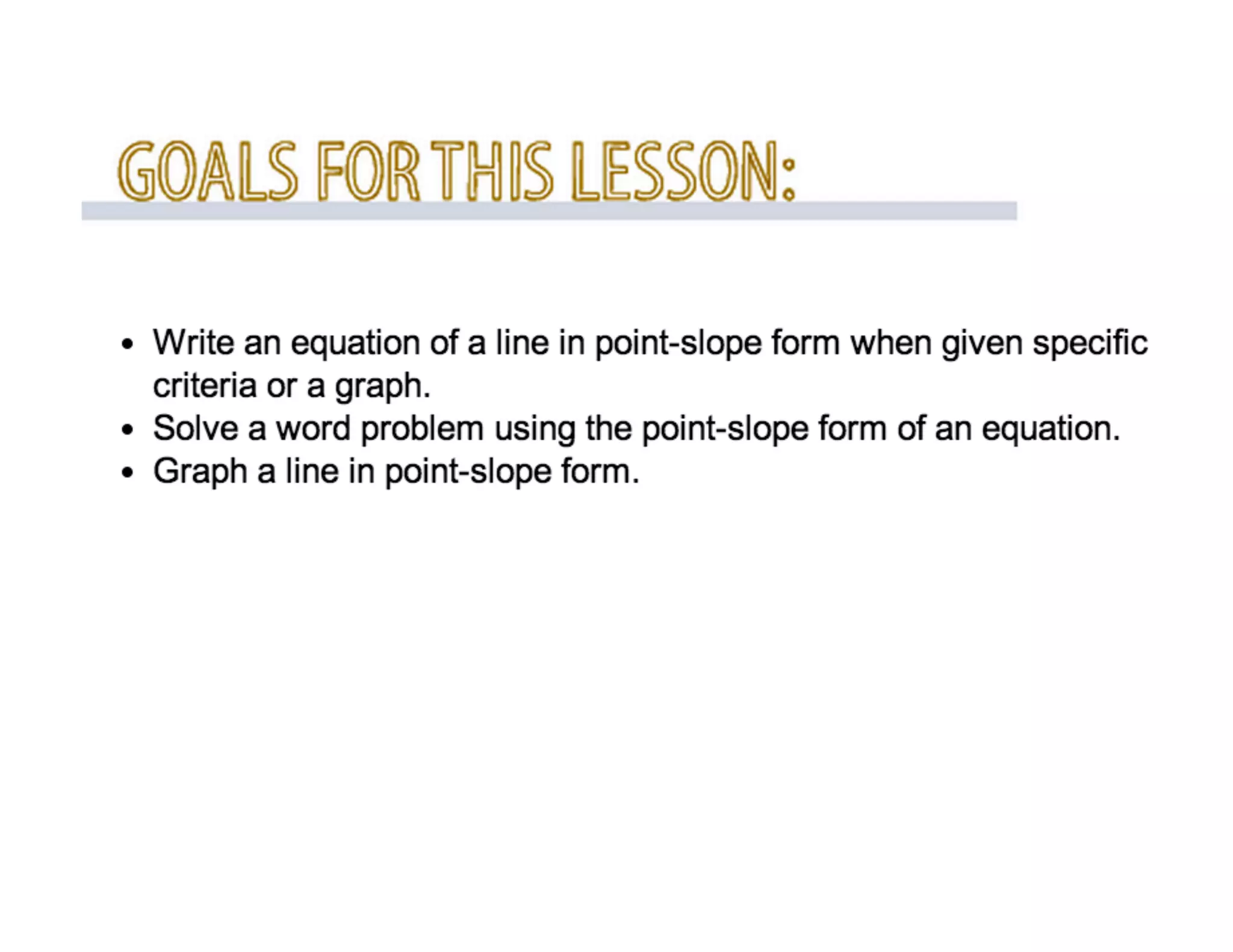 This document summarizes lesson 7.8 on point-slope form in algebra 1. It discusses the standard form, slope-intercept form, and point-slope form of a line, and how to write the equation of a line in point-slope form given a point and slope. It also shows how to work backwards by being given the point-slope form to find the slope and point. Students are given examples of using point-slope form and working backwards, and practice problems to complete on their own.