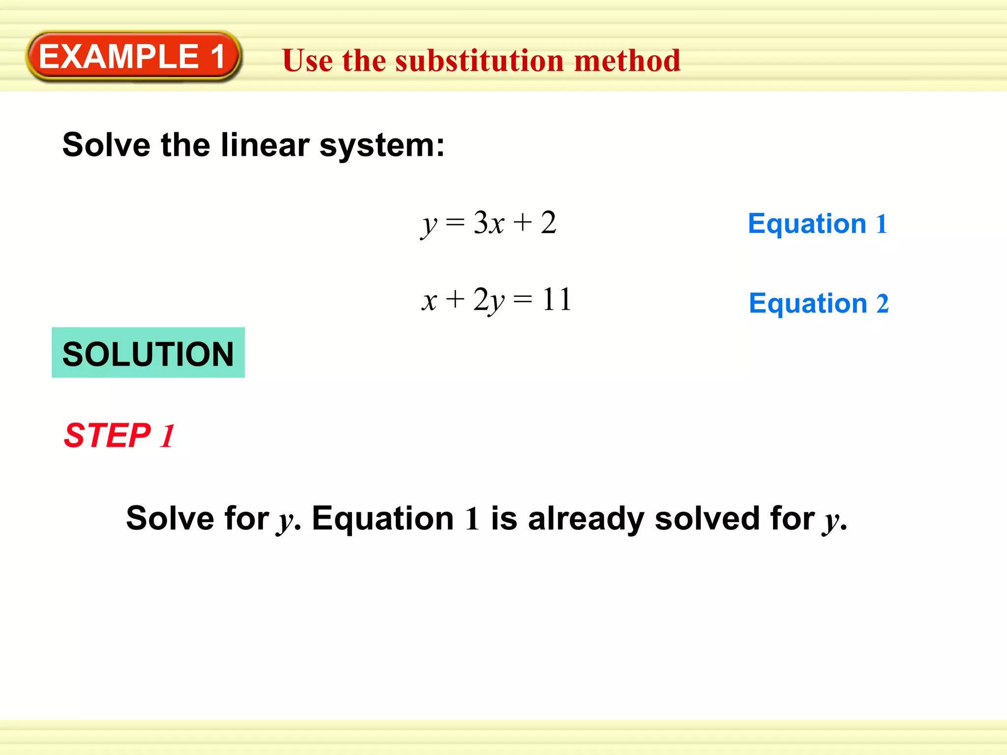 The document provides examples of using the substitution method to solve systems of linear equations. In Example 1, the system is solved to get the solution (1, 5). Example 2 is similarly worked through, yielding the solution (-2, 2). The guided practice exercises ask to use substitution to solve three additional systems of linear equations.