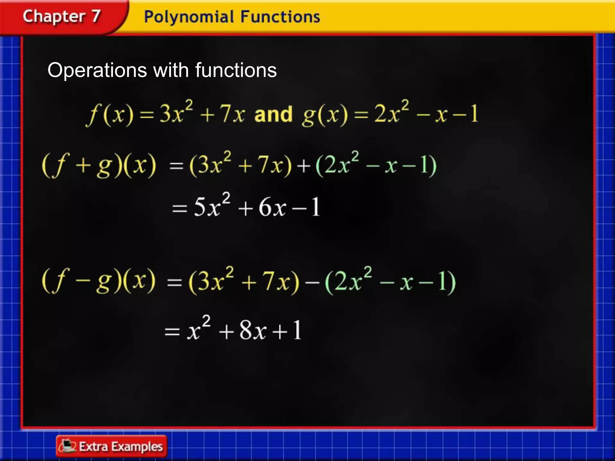 Functions take an input and return an output. Composite functions combine multiple functions by making the output of one function the input of another. For example, if f(x) is defined as x^2 and g(x) is defined as x + 1, then the composite function g(f(x)) would be x^2 + 1. To evaluate a composite function, you first apply the inner function f(x) and then apply the outer function g(x) to the result.