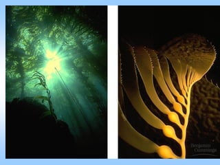 Algae are a diverse group of photosynthetic organisms that are either protists or primitive aquatic plants. They vary greatly in size and structure from single-celled to multicellular forms over 70 meters long. While similar to plants in some ways like possessing chlorophyll and cell walls, algae differ in lacking true roots, stems, leaves and vascular tissue. They are classified into seven phyla based on pigments, food storage and cell wall composition, with the Chlorophyta, Phaeophyta, and Rhodophyta being the major groups of green, brown, and red algae respectively. Algae play important ecological roles as primary producers and oxygen generators in many aquatic ecosystems.