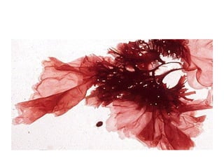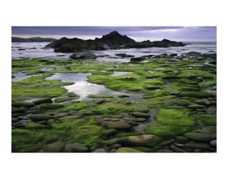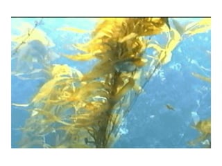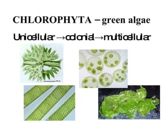 Algae are either plants or protists that live in or near water. They lack specialized root, stem, and leaf structures and must live in water to obtain nutrients and oxygen and remove waste through diffusion rather than an internal transport system. Adaptations for living in water include being thin enough not to dry out and having simpler reproductive cycles where gametes can swim to fertilize each other. Their divisions are categorized based on their pigments.
