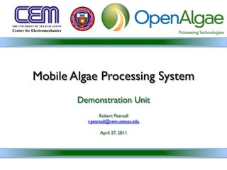 This document discusses the development of a mobile algae processing system. It notes that the algae biofuels industry currently lacks integrated processing technologies. The Center for Electromechanics has experience with process integration and bridging research to commercialization. They have previously scaled algae growth and tested concentration, lysis, separation and extraction technologies. The next step is to integrate these technologies into a demonstration-scale mobile unit capable of end-to-end algae processing up to several acres per day. This integrated system will demonstrate scalability and economics to help advance the algae biofuels industry.