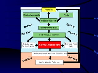 This document discusses algae, including their diversity, taxonomy, morphology, and impacts. It covers the major divisions of algae, including their distinguishing characteristics like photosynthetic pigments. Examples are provided of different algal forms ranging from unicellular to multicellular. Both beneficial roles of algae like food and industrial uses, as well as detrimental impacts like harmful algal blooms and shellfish poisoning are summarized. Specific examples are described to illustrate red tides, algal blooms, and cases of bird deaths potentially linked to algal toxins.