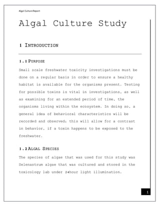 This document summarizes an algal culture study conducted from January to April 2015. Selenastrum algae was cultured under 24-hour light at a light intensity of 1000 lux. The algae was exposed to various concentrations of copper to determine the algistatic concentration. The tubes were shaken daily to keep the solutions homogenized. While the results were variable and inconclusive, toxicants like copper have the ability to inhibit algal growth in ecosystems.