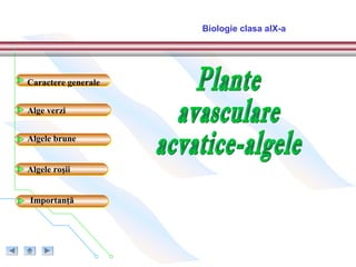 Documentul detaliază caracteristicile generale și clasificarea algelor, inclusiv algele verzi, brune și roșii, subliniind importanța lor ecologică și utilizările practice. Algile sunt plante avasculare și autotrofe, cu un ciclu de viață care include etapele haploide și diploide. Acestea contribuie semnificativ la oxigenarea apei și la formarea fitoplanctonului, având aplicații în agricultură, alimentație și medicină.