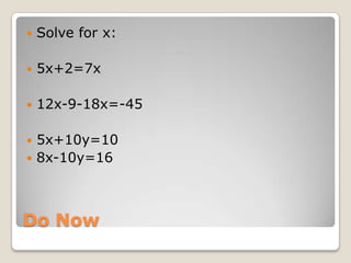 This document provides an overview of a unit on writing and solving two variable equations and systems of equations. It includes examples of solving systems of equations, word problems that can be modeled with systems, and an activity where students work in groups to create and solve their own word problem involving two variables. The homework asks students to explain on a WordPress site why they chose their word problem topic and whether solving systems could help problems in daily life.