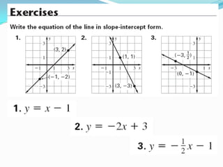 This document provides an overview of slope and how it is calculated and represented in algebra. It defines slope as rise over run and shows how to calculate it by counting squares between two points on a graph. Positive and negative slopes are introduced, as well as the slope-intercept form of a line, y=mx+b, where m is the slope and b is the y-intercept. Examples are given of calculating slope from points and graphing lines in slope-intercept form. Requirements for using the point-slope form, y-y1=m(x-x1), are also outlined.