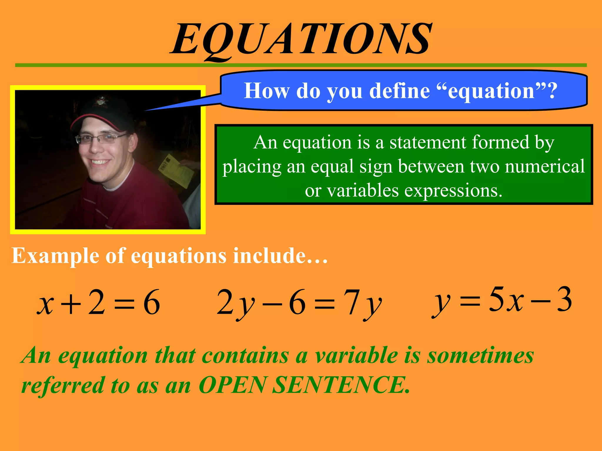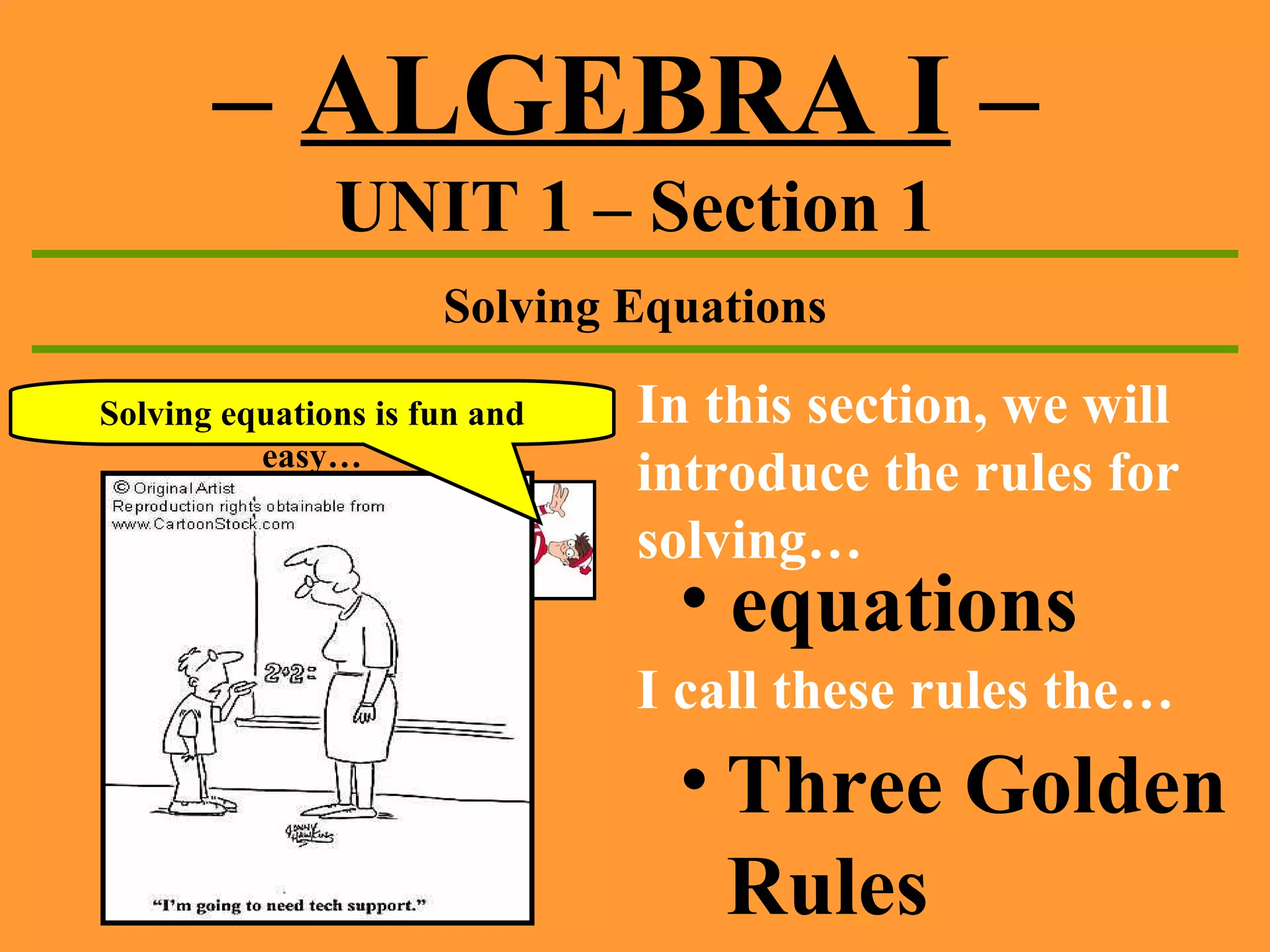 This document introduces solving equations using the Three Golden Rules: 1) Get the variable by itself, 2) Do the opposite operation to isolate the variable, and 3) Perform the same operation to both sides of the equation. It provides examples of equations and their definitions. Key terms are defined such as domain, solution, and root. Sample problems are given for the reader to practice applying the Three Golden Rules.