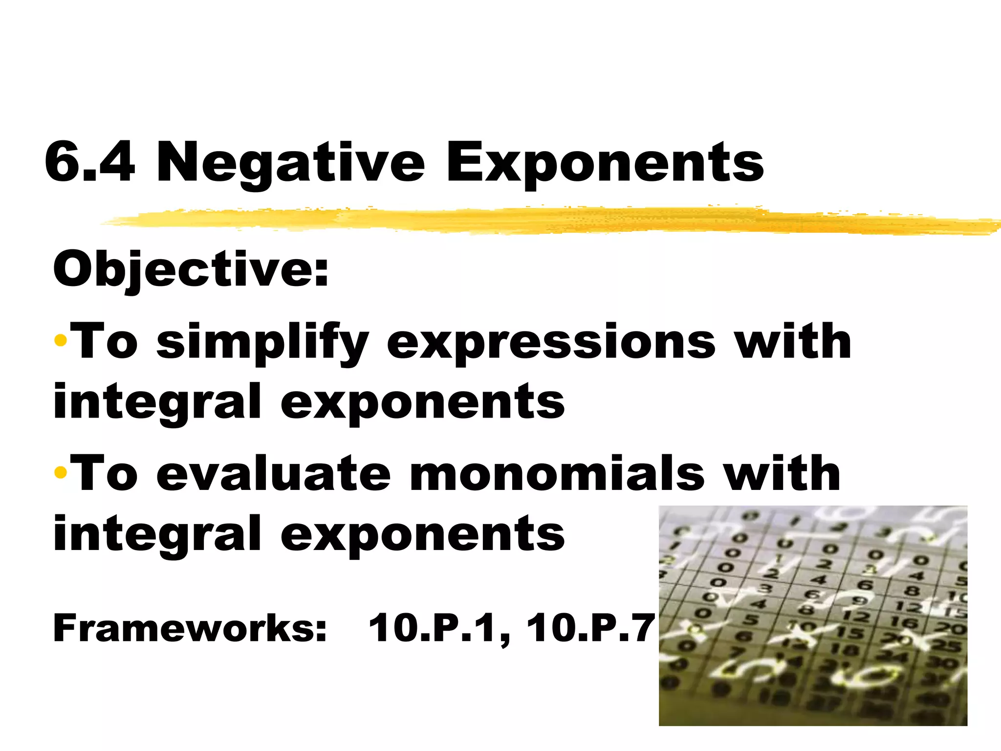 This document discusses negative exponents and how to simplify expressions with negative and fractional exponents. Some key points: 1) A zero exponent evaluates to 1, so b0 = 1 for any nonzero real number b. 2) For a negative exponent b-n, where b is a nonzero real number and n is a positive integer, b-n = 1/bn. 3) Examples are provided of simplifying expressions using negative exponent rules, such as reducing 3x-4 to 1/(3x)4 when x = -2. 4) Expressions with mixed negative, positive, and fractional exponents can be simplified to expressions with only positive exponents.