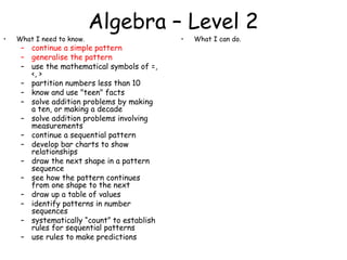 This document provides an overview of 5 lessons on patterns involving different types of fictional insects called Pedes. The lessons involve continuing numerical and shape patterns, generalizing the patterns, and answering questions to demonstrate understanding of the patterns. Students are asked to create PowerPoint slides to represent patterns involving Humped-Back Pedes, Spotted Pedes, and Big-Headed Pedes. They are to record their observations and generalizations about the patterns. The goal is for students to learn to continue simple patterns, generalize patterns, and show they have understood the patterns through their responses.