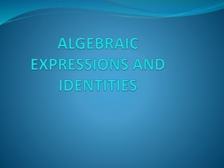 Algebraic expressions can be formed using variables, constants, and mathematical operations. Variables represent letters that can take on any value, while constants represent fixed numbers. There are different types of algebraic expressions including monomials, binomials, and trinomials. The value of an algebraic expression can be found by substituting values for the variables and simplifying. Identities are equations that are always true regardless of the values of variables. Common identities include (a+b)2, (a-b)2, and a2 - b2.