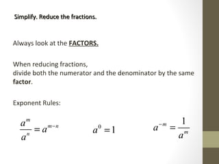 - Simplifying and reducing rational expressions by dividing both the numerator and denominator by common factors.