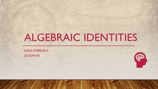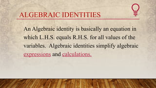 Algebraic identities are equations where the left-hand side equals the right-hand side for all variable values, simplifying expressions and calculations. Two-variable identities such as (a+b)² and (a-b)² are fundamental, with additional cubic identities like (a−b)³. The document includes examples demonstrating the application of these identities to solve problems.