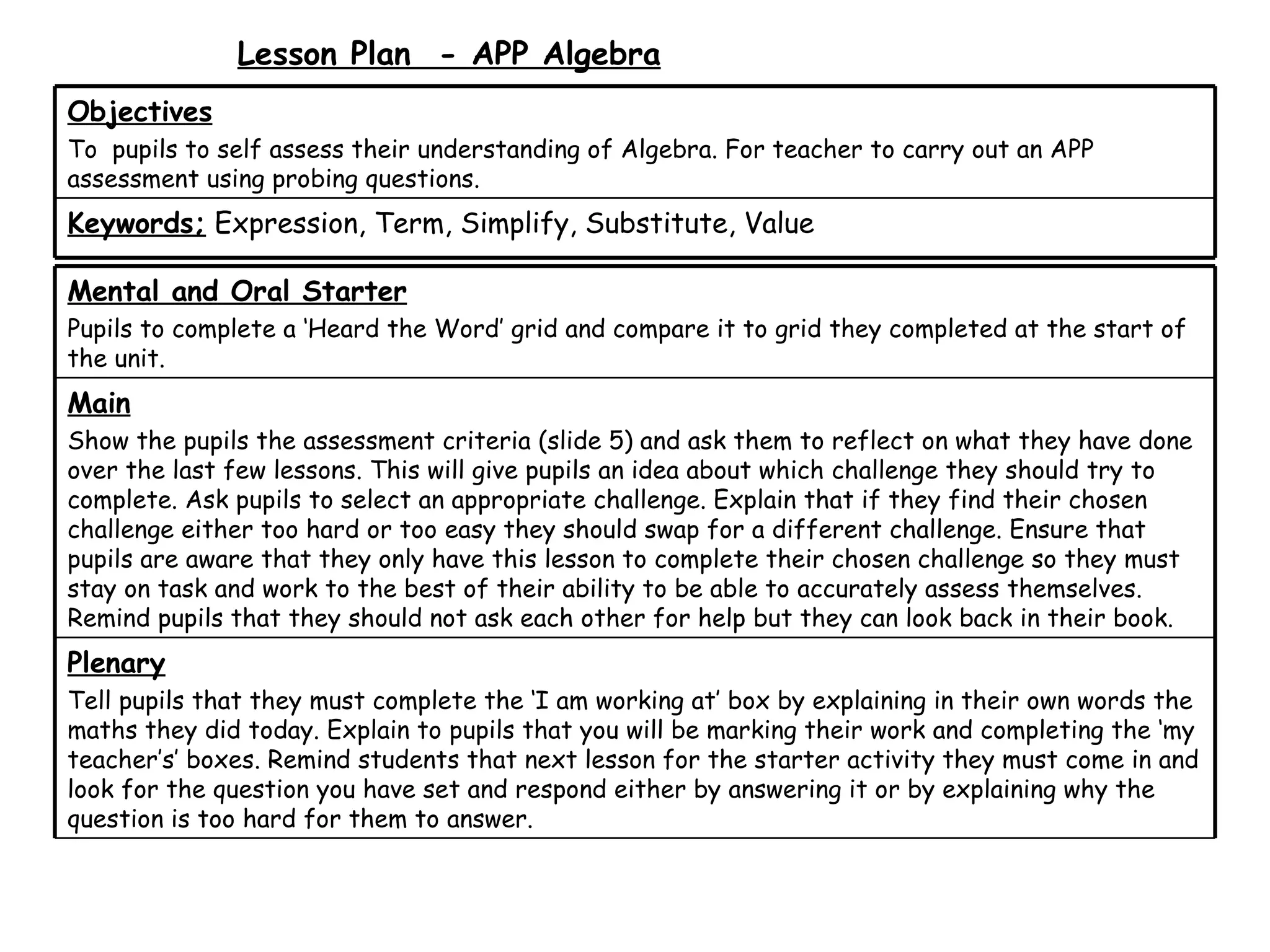 The document outlines an algebra lesson plan that includes a starter activity reviewing key terms, an independent practice session where students select challenge problems to assess their understanding, and a plenary where students self-assess their work and the teacher provides feedback and previews the next lesson's starter activity. The challenge problems cover simplifying expressions, substituting values, constructing equations, and other algebra skills at various levels of difficulty.