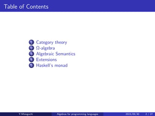 This document discusses category theory and algebraic semantics for programming languages. It defines categories, functors, natural transformations, Ω-algebras, (Ω,E)-algebras, and monads. Ω-algebras allow modeling algebraic structures like groups. (Ω,E)-algebras satisfy equations E and have a free algebra. Monads correspond to algebraic theories and define Kleisli categories of algebras. Algebraic semantics uses axioms and rules to prove equalities in (Ω,E)-algebras.