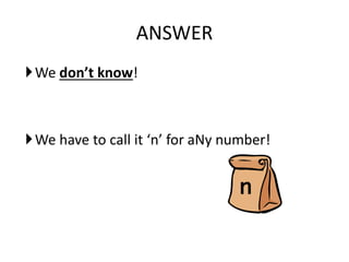 The document discusses how to represent an unknown quantity of sweets using algebraic expressions, denoting unknown number of bags as 'n'. It provides examples of forming expressions like '3n + 3' and guides on illustrating these expressions graphically. The focus is on manipulating and understanding these mathematical representations.