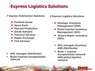Express Logistics Solutions 7 Express Distribution Solutions Finished Goods Spare Parts Planned Production Goods Samples Financial Services Repair Exchange Test Services DHL manages Distribution Basis=express transportation network 3 Express Logistics Solutions Strategic Inventory Management (SIM) Direct Express Inventory Management (DEI) Return Repair Inventory (RRI) DHL manages Inventory AND Distribution Basis = express transportation network AND global logistics network