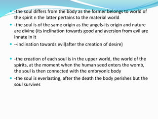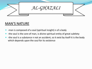 This document discusses man's nature according to Al-Ghazali. It states that man is composed of a soul and body, with the soul being divine and eternal while the body is temporary. The soul comes to the world through the body in order to acquire knowledge and prepare for the afterlife. Man has four elements - animality, bestiality, diabolic, and lordly - that develop at different stages and influence his actions. Al-Ghazali also discusses the four faculties of the soul - desire, anger, knowledge, and justice - and how they interact with one another and can be controlled or lead to evil.