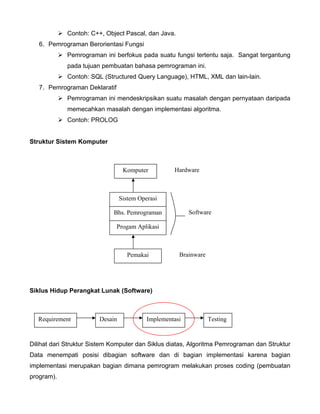 Dokumen ini membahas berbagai paradigma pemrograman seperti pemrograman prosedural, fungsional, terstruktur, modular, berorientasi objek, dan deklaratif. Selain itu, menjelaskan tentang algoritma dan langkah-langkah dalam pemrograman, termasuk definisi, contoh, dan prinsip-prinsip suatu algoritma. Terdapat juga contoh soal algoritma dalam konversi suhu, pembentukan sisi miring segitiga, serta pengenalan bahasa pemrograman dan proses pengujian program.