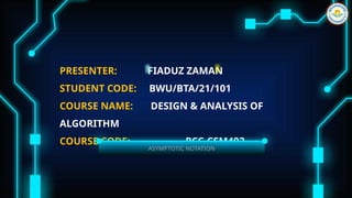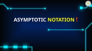 The document discusses asymptotic notation, a mathematical tool for measuring and comparing algorithm efficiency. It explains three main types of notation: big O for upper bounds (worst-case complexity), omega for lower bounds (best-case complexity), and theta for both bounds (average-case complexity). The document includes examples and definitions, alongside references for further reading.