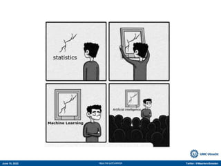 The document appears to be a Twitter thread by Maarten van Smeden discussing various topics related to machine learning and its applications in medicine. It includes links to several studies and articles. The thread touches on a number of issues, including the increasing use of AI in medical publications over time; examples of successful applications of machine learning like detecting diabetic retinopathy and tuberculosis; potential issues and misconceptions around ML methods; and the importance of accounting for bias, variance, and irreducible error in clinical prediction modeling.