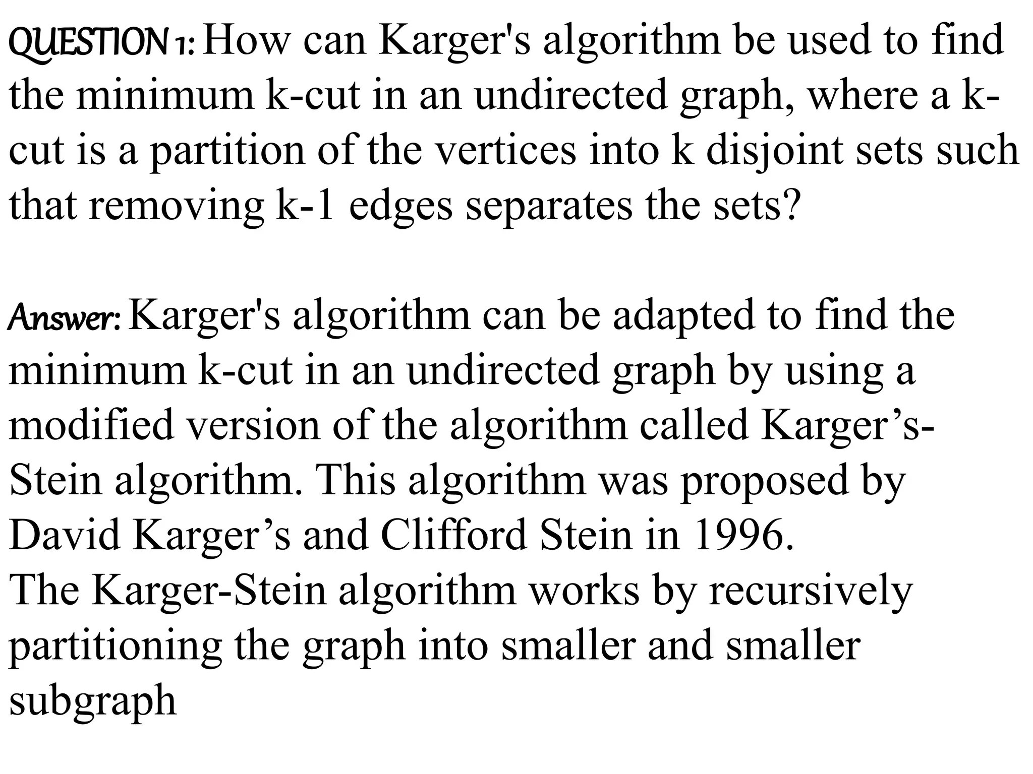Karger's min-cut algorithm can be adapted to find the minimum k-cut in an undirected graph using the Karger-Stein algorithm, which recursively partitions the graph and identifies minimum cuts. The algorithm has a running time of O(n^2 log k) and is useful for applications like VLSI design and image segmentation. Additionally, the probability of Karger's algorithm failing to find the minimum cut decreases exponentially with the number of iterations, making it more reliable with increased runs.
