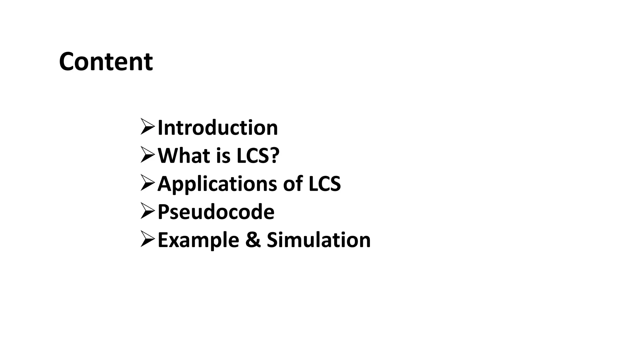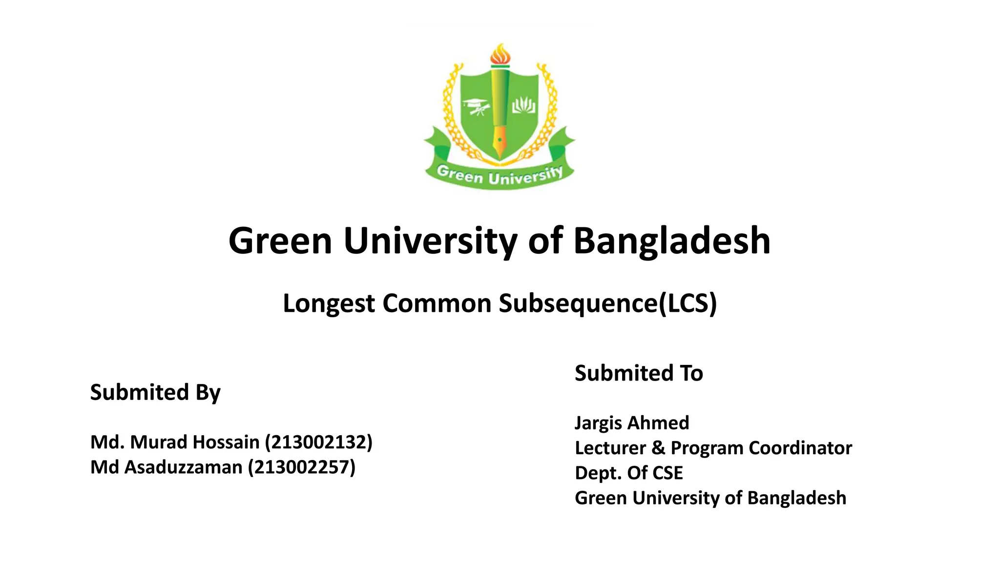 This document discusses Longest Common Subsequence (LCS) and provides an example. It begins with an introduction that defines LCS as the longest sequence of characters common between two or more strings. It then discusses applications of LCS in bioinformatics, plagiarism detection, and version control systems. An example is provided comparing the strings 'ABCD' and 'ACDF' where the LCS is 'ACD'. The document concludes with a step-by-step simulation of finding the LCS between the strings 'R,G,B,G,A,R' and 'B,G,R,A,R', which is 'BGAR'.