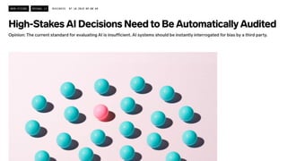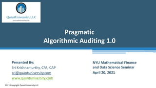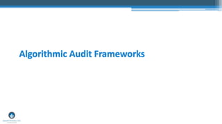 The document presents an overview of algorithmic auditing in the context of finance, emphasizing its importance for ensuring compliance, transparency, and fairness in machine learning applications. It discusses various frameworks and processes for conducting audits, the challenges faced in auditing AI algorithms, and the necessary expertise for auditors. Additionally, it highlights the role of regulatory bodies and the need for continuous skill development in the auditing community to keep pace with advancements in machine learning.