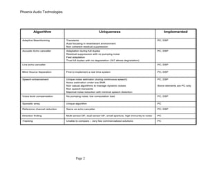 Phoenix Audio Technologies offers a diverse range of algorithms to extract desired audio signals from noisy environments and improve audio clarity. Their solutions include multi-sensor processing, adaptive beamforming, echo cancellation, and single sensor speech enhancement, designed to address various challenges in real-time audio processing. The document details the features, maturity, and specific use cases of these algorithms, showcasing their effectiveness in both operated and experimental environments.