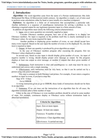 This document provides an introduction to algorithms including definitions, characteristics, and the design process. It defines an algorithm as a finite set of unambiguous instructions to solve a problem. Key points: