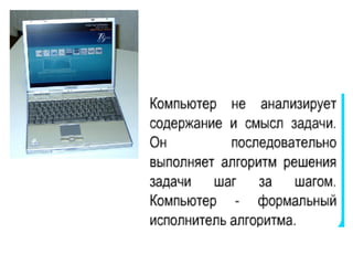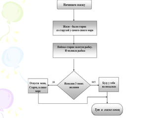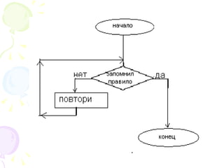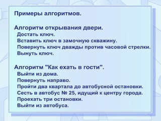 Документ описывает алгоритмы и их использование в различных аспектах жизни и обучения, подчеркивая их роль как последовательностей действий для достижения целей. Он объясняет свойства алгоритмов, такие как понятность, дискретность и конечность, а также предлагает различные способы их представления, включая словесные, графические, формульные и табличные. В документе также рассматриваются типы алгоритмов — линейные, разветвляющиеся и циклические — с примерами их применения.