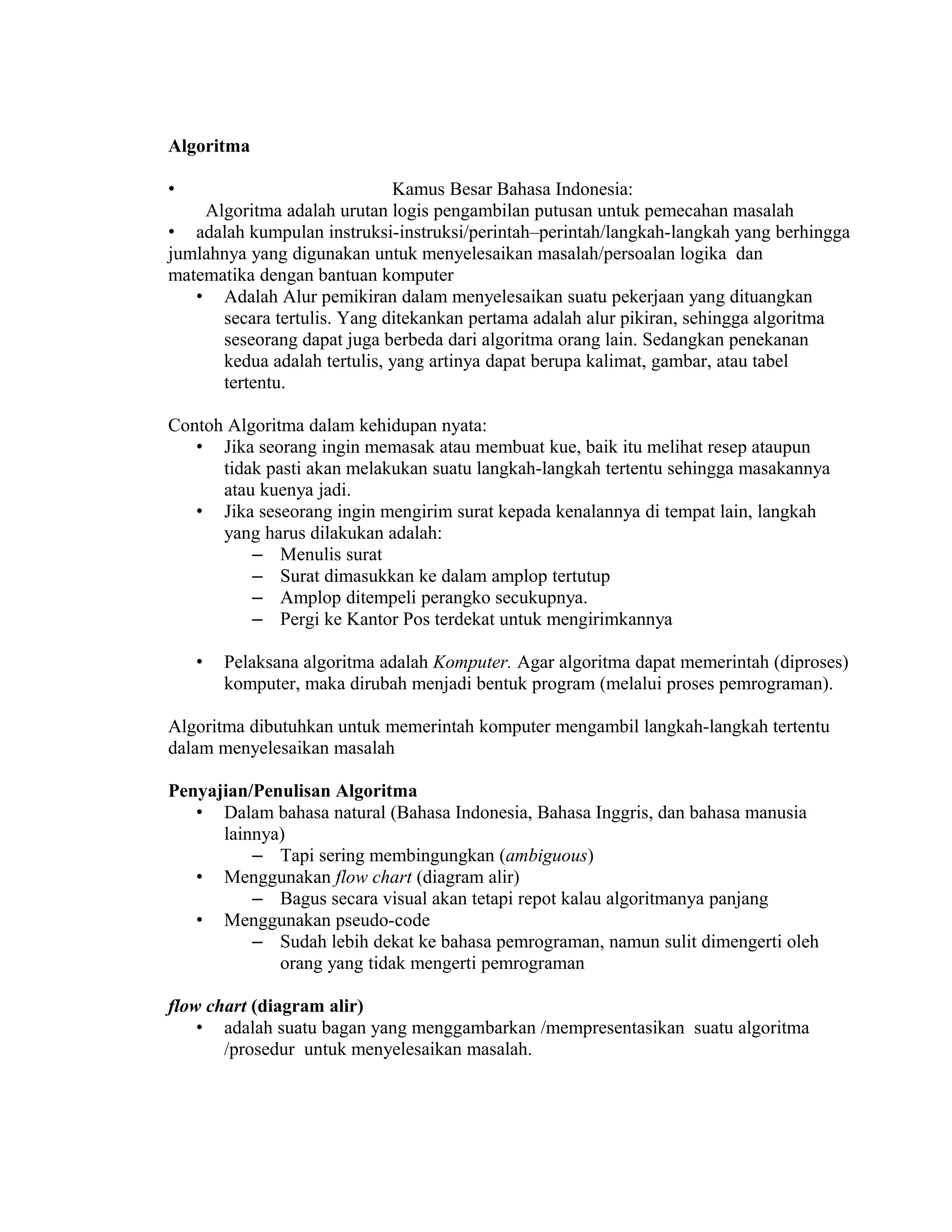 Algoritma adalah urutan langkah logis untuk menyelesaikan masalah yang dapat dijalankan oleh komputer. Algoritma membutuhkan input dan memberikan output, serta terdiri dari struktur sekuensial, percabangan, dan perulangan. Algoritma harus efektif dan efisien serta memberikan output terbatas.