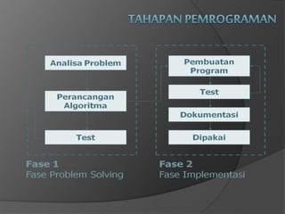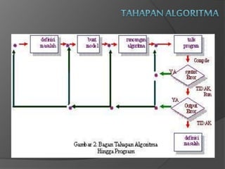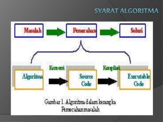 Dokumen tersebut membahas tentang definisi algoritma, pertimbangan pemilihan algoritma, perbedaan antara algoritma dan program, ciri-ciri penulisan algoritma yang baik, syarat algoritma, proses pemecahan masalah dengan algoritma, analisis masalah, pseudocode, kalimat deskriptif, dan flowchart. Diberikan juga contoh soal untuk dibuatkan algoritmanya dalam bentuk pseudocode.