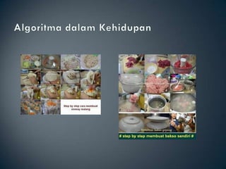 Dokumen ini membahas tentang algoritma dan flowchart, yang merupakan inti dari ilmu komputer. Algoritma didefinisikan sebagai urutan langkah-langkah logis untuk menyelesaikan suatu masalah dan dapat diterapkan dalam kehidupan sehari-hari, seperti resep makanan. Flowchart adalah representasi visual dari algoritma yang menunjukkan alur proses dengan simbol tertentu, terdiri dari bagian input, proses, dan output.